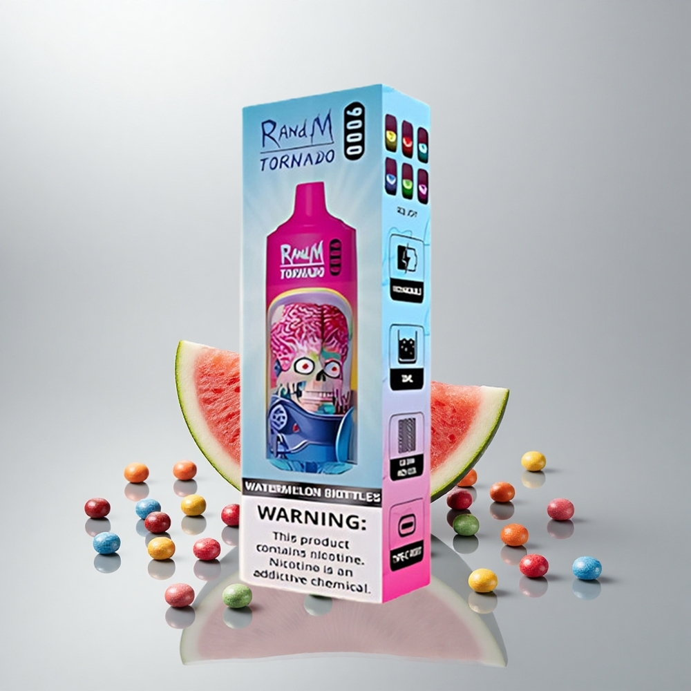 RandM Tornado 9000 Puffs Vesimeloni Skittles 850 mAh Ladattava 18 mL Mesh-käämi RGB-näyttö