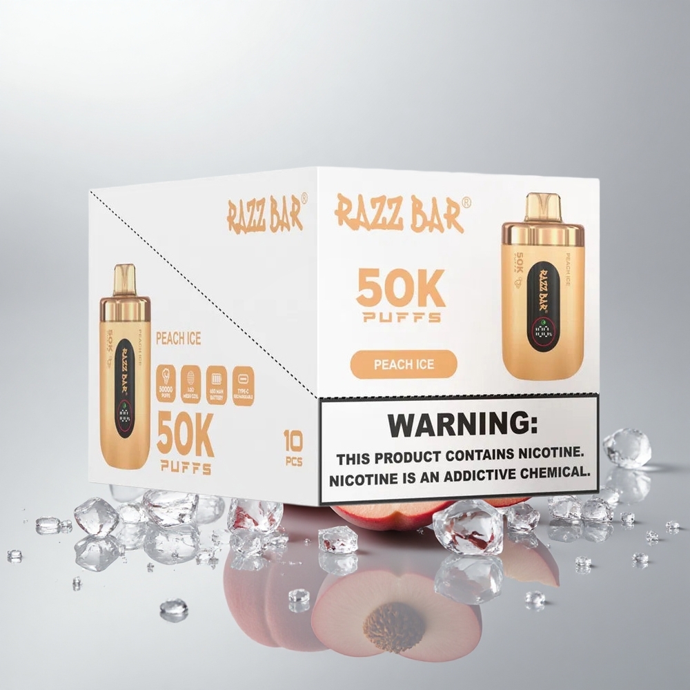 Razz Bar 50K Puffs 50000 Töörynää 1.0 Ohm Verkkokäämi 650 mAh Akku Type-C Ladattava 2% Nikotiinia Persikka-Jää